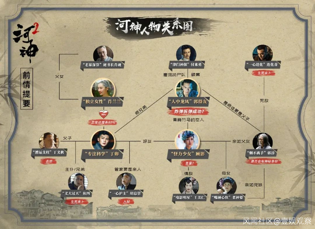 ▲ 《河神》系列人物關係既然搭建了宇宙,聯繫與貫穿的元素必不可少。除了主要角色之外,《河神2》與《河神》相同的津門色彩,更為密集的歇後語、俗語台詞設置,甚至片頭關鍵詞獨白風格等都算得上一種延續。