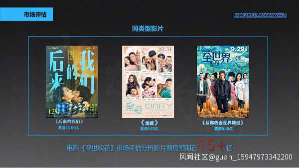 對標作品《後來的我們》13.61億票房,《寵愛》6.83億票房,《從你的全世界路過》8.13億票房。優質愛情喜劇電影成本,再加上眾多大牌實力派演員加盟,相信會是下一個項目熱點。第一齣品《浮世吹花》歡迎對接V:769483599。