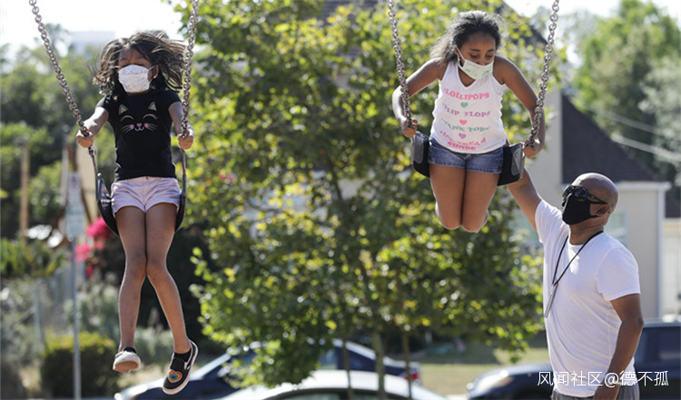 ▲7月11日,孩子們戴着口罩在美國洛杉磯盪鞦韆|新華社