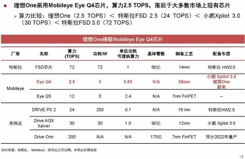 因此,理想ONE的芯片算力為2.5TOPS,這種算力水平在市場現有芯片中處於“墊底”位置——據中信證券數據進一步顯示,目前新能源汽車的算力排序為:理想ONE(2.5TOPS)<特斯拉FSD2.5(24TOPS)。