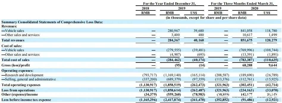 「子彈財經」從招股書中看到,理想汽車目前尚未盈利,其經營虧損2018年為11.31億元;2019年虧損進一步擴大為18.89億元(約合2.62億美金);2020年Q1虧損為2.34億元人民幣(約合3310萬美元),較去年同期有所收窄。