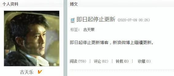 2020年7月9日,古天樂宣佈一個消息:博客停止更新,微博則繼續保持更新的狀態。