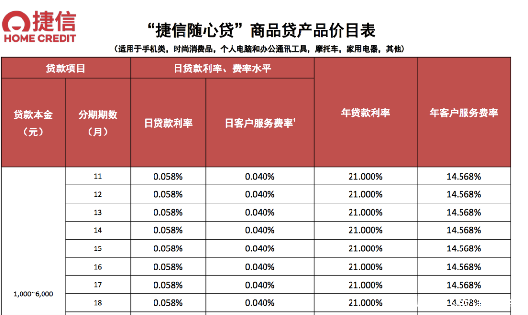 捷信官網顯示,捷信隨心貸年利率21%,年服務費率14.568%,客户借款成本接近36%紅線。