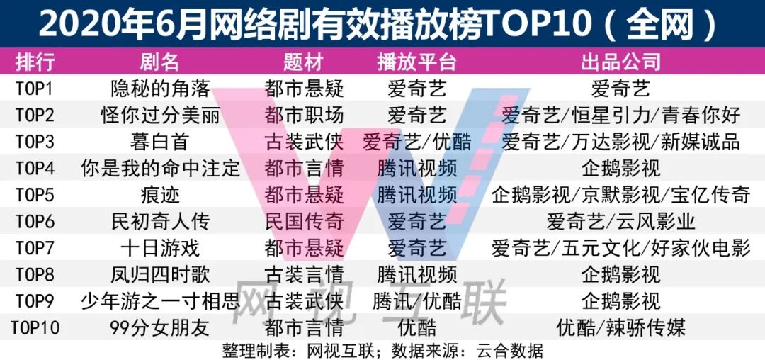 因為《隱秘的角落》《怪你過分美麗》《十日遊戲》等高口碑的爆款網絡劇的上線,6月份網絡劇市場迎來了2020年的又一波高潮。