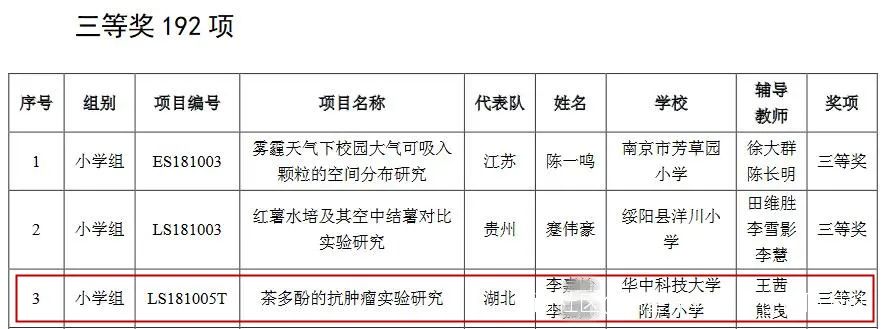 在上屆大賽小學組三等獎名單中,有兩名小學生因研究茶多酚抗腫瘤獲獎。