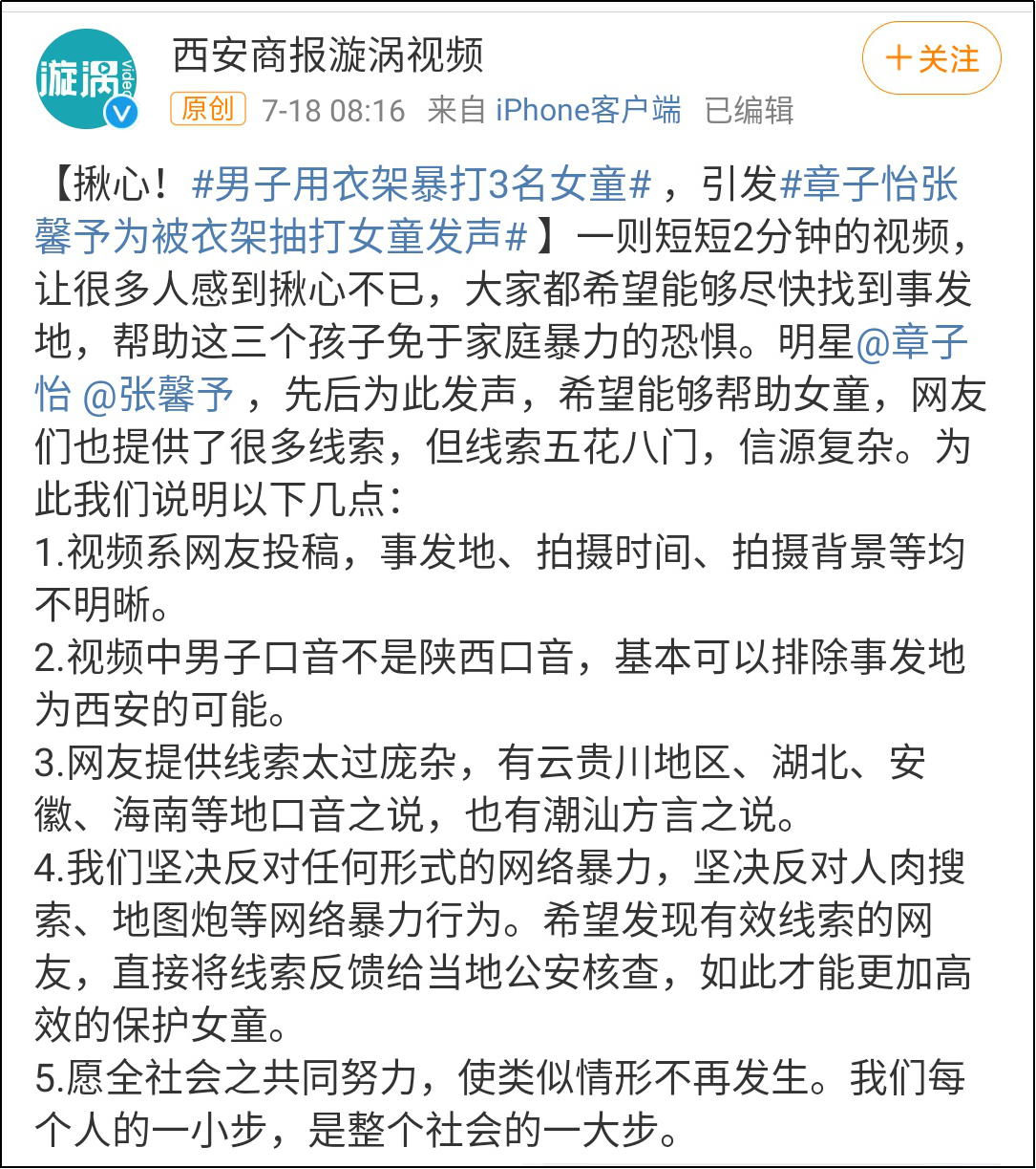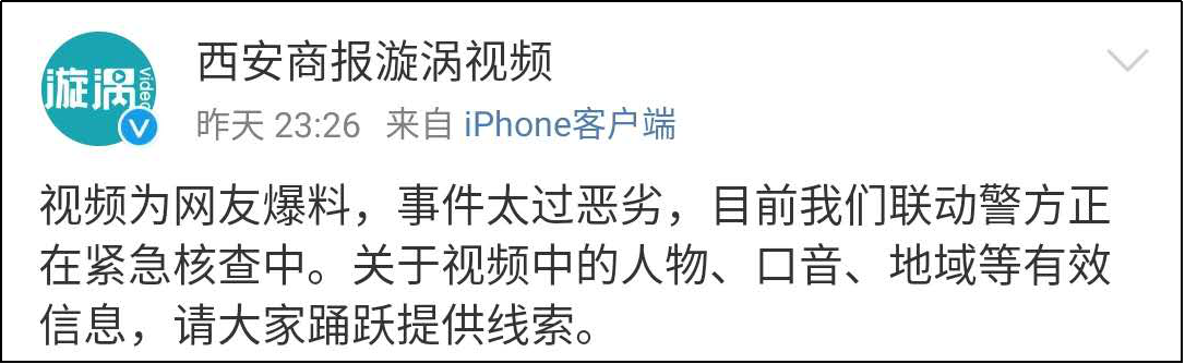因此,這段視頻究竟拍於何時何地?男子為何要暴打女孩?女孩們的受傷情況如何?男子、女孩與視頻拍攝者之間又是什麼關係?這些問題還有待挖掘,據@西安商報漩渦視頻 介紹,目前已聯動警方正在緊急核查相關信息。