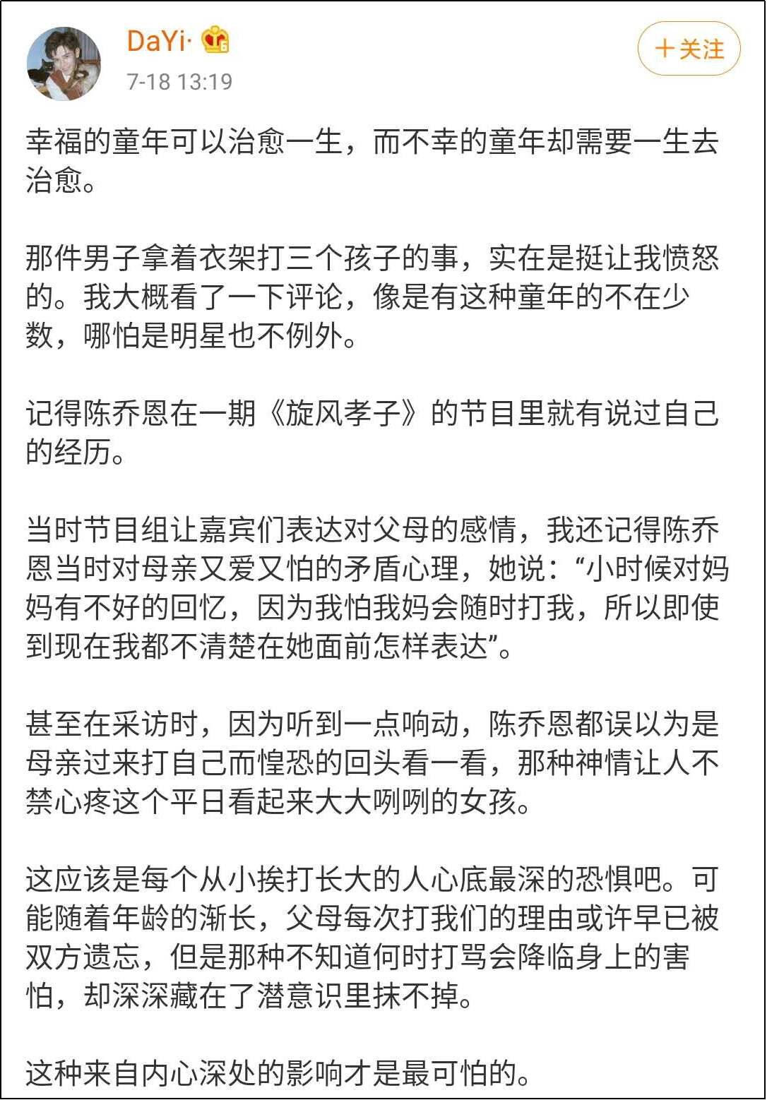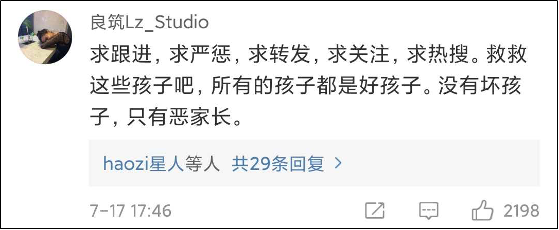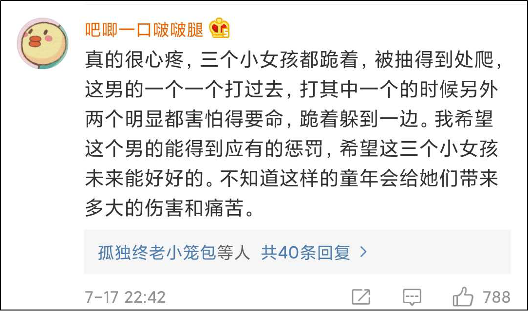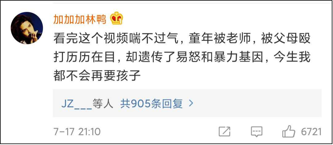 如果自己小時候也被父母虐打過,這樣的痛苦經歷一定是一輩子無法癒合的,可是當你長大以後,看見其他小孩經歷着和你一樣的痛苦,那份感同身受,應該是更讓人憤怒的。而不是説“這就是中國式家庭教育阿。我小時候就這樣,很普遍了”。
