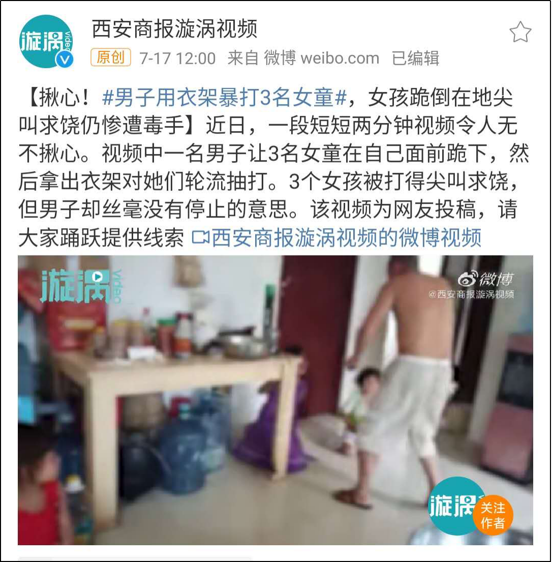 7月17日,@西安商報漩渦視頻 上傳了一段網友投稿的視頻,視頻中一名男子讓3名女孩在自己面前跪下,然後拿出衣架對她們輪流抽打。3個女孩被打得尖叫求饒,但男子卻絲毫沒有停止的意思。
