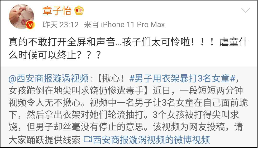 同時,知名藝人章子怡與張馨予在看到這段視頻後也分別轉發並強烈譴責虐童行為,使這一事件得到了更大規模的關注與討論。