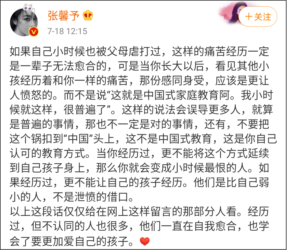 對網友所謂“這就是中國式教育”、“這很普遍”的説法,張馨予特意發文批駁,表示這種被父母虐打的痛苦經歷一定是“一輩子無法癒合的”。如果有類似的經歷,那這種教育方式不應該延續到自己孩子身上。同時,這也不是“中國式教育”,而是“你自己認可的教育方式”。