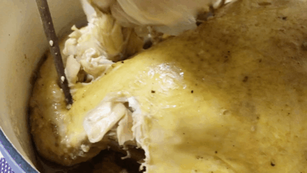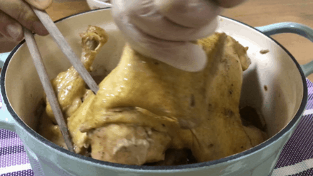所以燉的過程你該幹嘛幹嘛去,30-40分鐘後,你開蓋用筷子戳一下雞腿兒(那裏肉最厚),發現噗嗤就戳進去了,跟雞説聲打擾了的同時,你也知道這隻雞,能吃了!