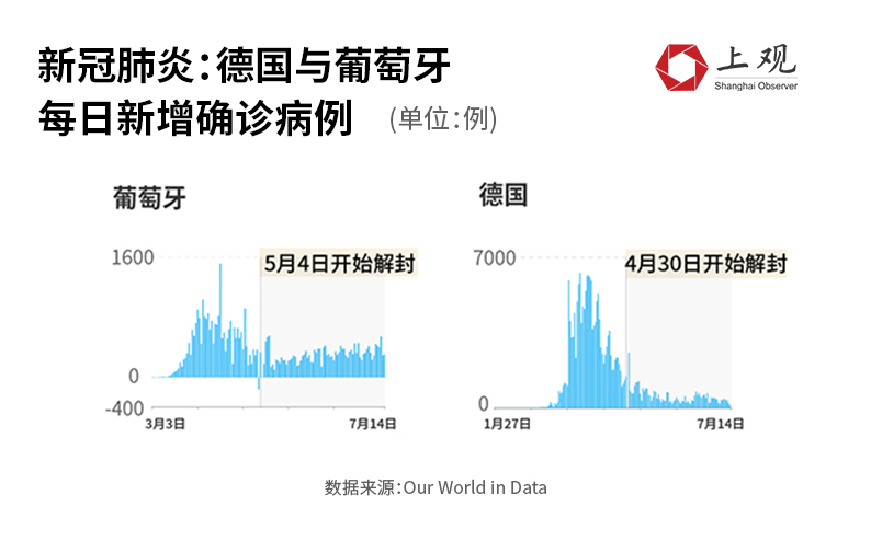 除此以外,德國、瑞士、葡萄牙等歐洲國家的疫情都曾在解封后出現輕微的反彈,但還沒有持續顯著上升的跡象。