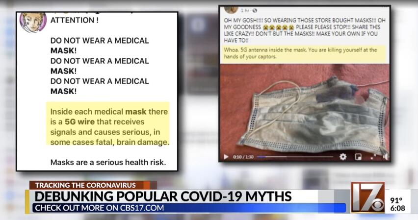 CBS17電視台追蹤到了該謠言的起源,是一個女性網友發佈的視頻。視頻中,該網友剪開了口罩,並指着壓鼻樑的金屬條説是“5G天線”。