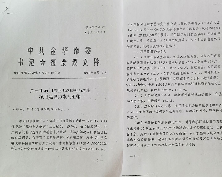 知情人士透露,上述住建部門呈送的《關於金華市石門農墾場職工住房問題解決方案的請示》“晚於”農場上報危舊房改造計劃,部分原因是,《請示》報告的最後定稿受到了藥廠職工的影響。