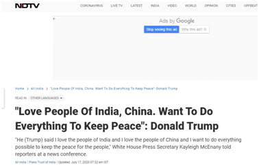 NDTV:特朗普説,“我愛印度人民,我愛中國人民,我願意盡一切可能為他們維護和平”