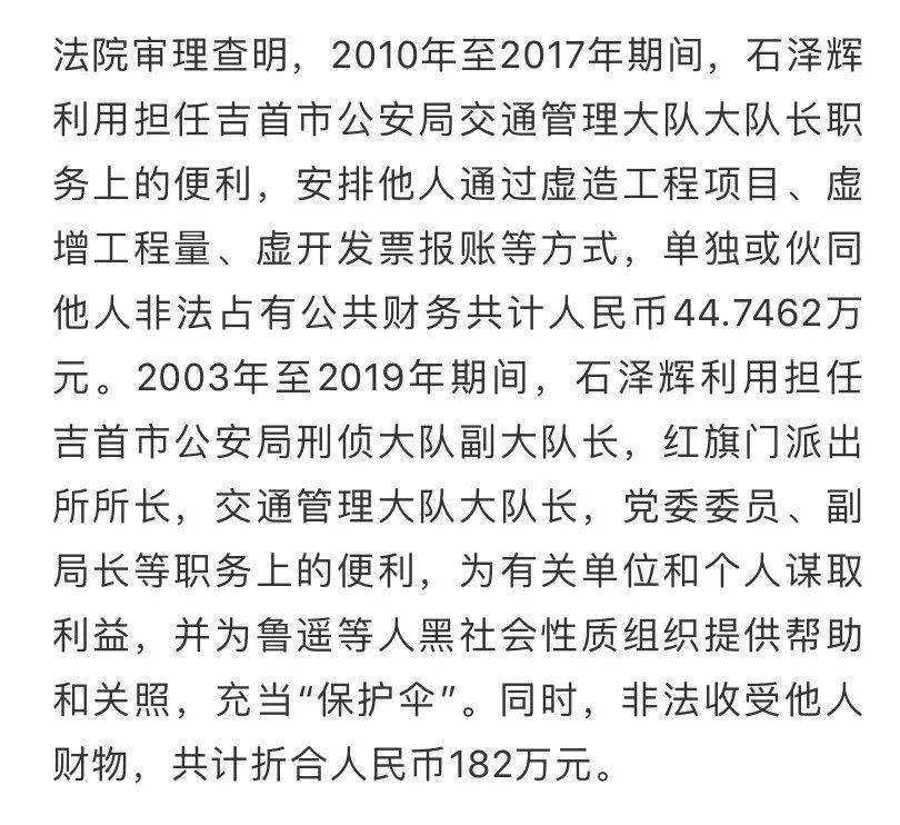 6月16日,湘西瀘溪縣人民法院一審公開宣判吉首市公安局原黨委委員、副局長石澤輝貪污、受賄案,對被告人石澤輝以貪污罪、受賄罪判處有期徒刑六年六個月,並處罰金五十萬元;對石澤輝違法所得未退繳部分,依法予以收繳,上繳國庫。