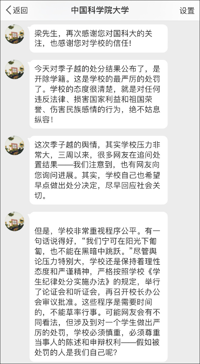 @全真道士梁興揚 在自己的微博透露,國科大通報發佈後,曾通過微博私信向其解釋了為什麼學校在事情發生後這麼長時間才通報處理結果。國科大表示,學校也希望早點做出處分決定,儘早回應社會關切,但是,學校非常重視程序公平,而這些程序需要一些時間。