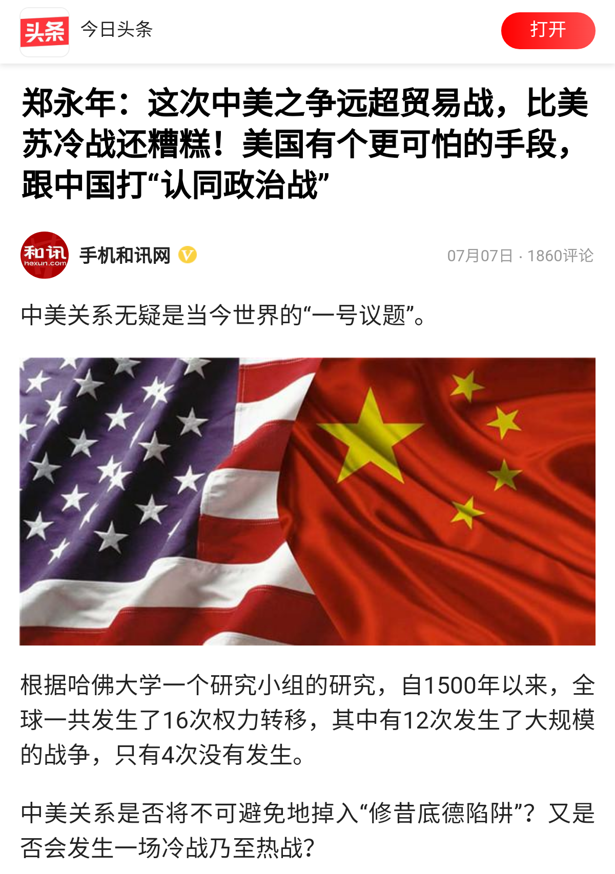 鄭永年先生近期接受“正和島”徐悦邦採訪,就中美之爭發表了一系列看法,手機和訊網、今日頭條等皆予刊載。有興趣的同志可以親自看看原文。