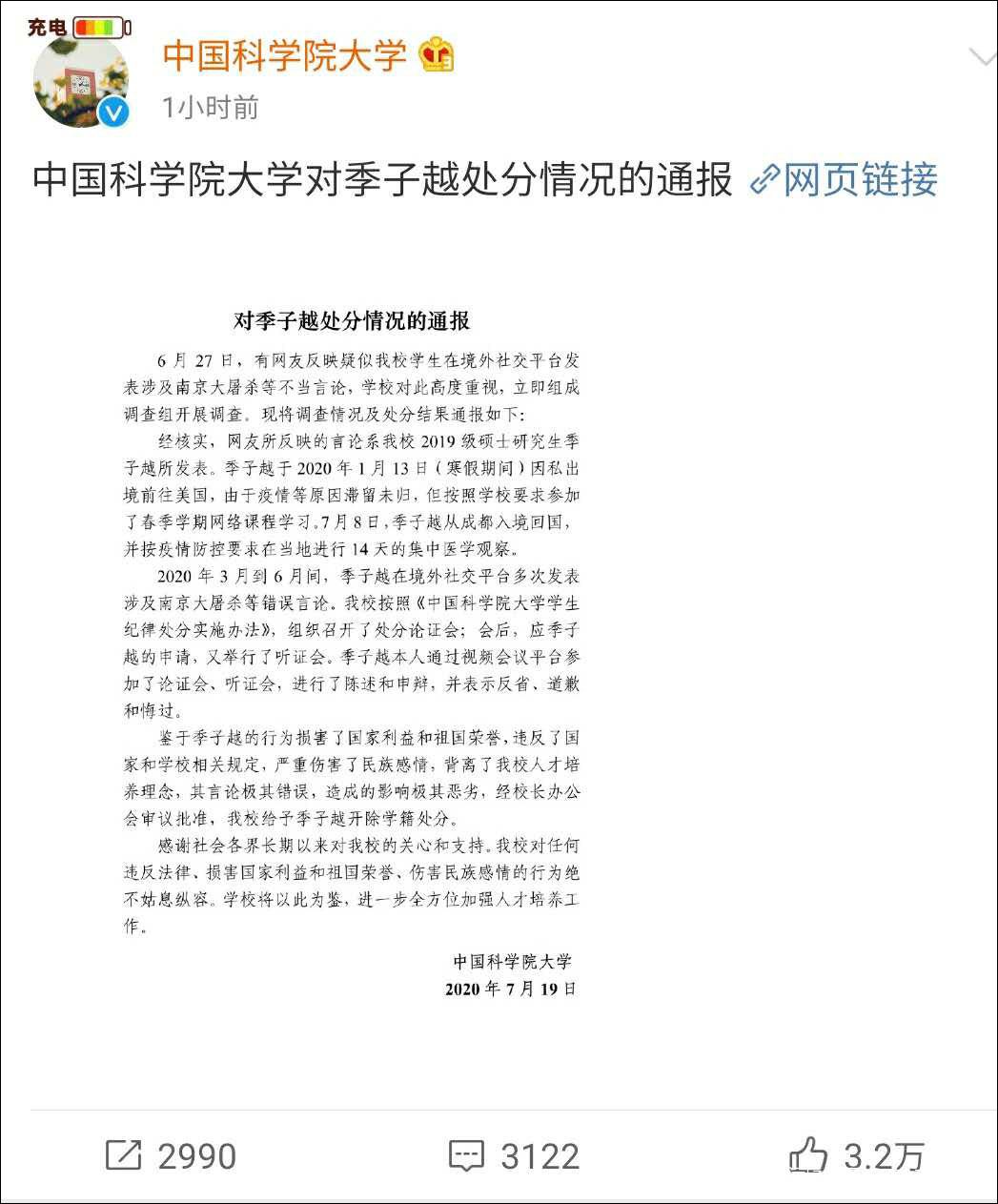 7月19日,@中國科學院大學 官方微博發佈《中國科學院大學對季子越處分情況的通報》。