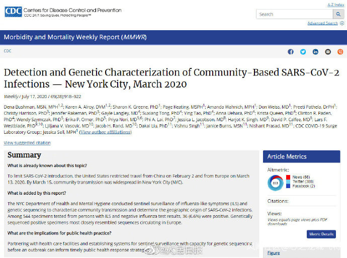 【#美疾控中心稱紐約流行毒株與中國毫無關係#】據@CGTN ,美國疾控中心17日發佈報告説,特朗普早在2月2日就匆忙發佈對中國遊客的入境禁令,可直到3月13日才宣佈對歐洲國家實行入境限制,但到3月8日,新冠病毒早就開始在紐約市的社區傳播。此外,報告還揭示了一個發現:紐約市流行的毒株與中國武漢毫不相干。紐約州長科莫針對該報告回應稱,因為政府應對疫情失措,病毒傳到了紐約市,導致這麼多美國人丟掉了性命。