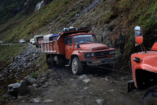墨脱境內的一輛卡車牽引陷入淤泥的貨車。