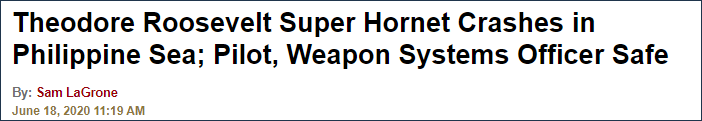 美國海軍協會報道:羅斯福號一架F-18F艦載機在菲律賓海墜毀