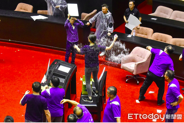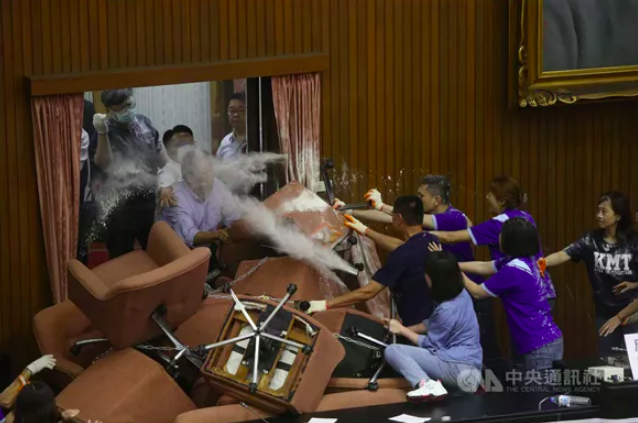 7月17日,台灣“立法院”進行“監察院”人事案投票,因藍營反對包括陳菊在內的被提名人名單,國民黨“立委”通過破壞圈票處、擲水球表達不滿,民進黨“立委”則舉起白色厚紙板、穿上雨衣“備戰”。此後雙方發生“混戰”,不少“立委”甚至大打大出手再次上演全武行。