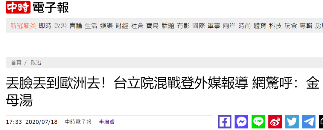 藍綠“鬥毆”被法新社報道的消息傳回台灣,“中時電子報”進行了報道,標題上出現“丟臉丟到歐洲”字眼。↓
