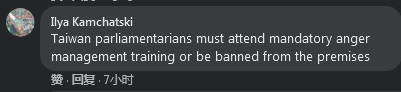 網友Ilya Kamchatski調侃稱,“台灣‘議員’必須參加強制性的憤怒情緒管理培訓,否則不得進入會場。”↓