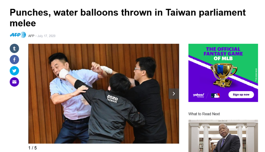 不僅如此,法新社當天還發表了題為“台‘立法院’內混戰:揮拳頭、扔水球”的報道。↓