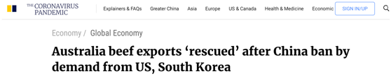 《南華早報》:中國禁止澳大利亞牛肉後,美國、韓國的需求“拯救”了澳大利亞牛肉出口 《南華早報》援引澳洲肉類及畜牧業協會(MLA)的説法稱,被禁的4家出口商中有3家就在澳大利亞昆士蘭州。該州將大部分過剩的牛肉出口到美國和韓國,後者傳統上主要從美國進口牛肉。據報道,這四家出口商約佔澳大利亞對華牛肉出口的20%。