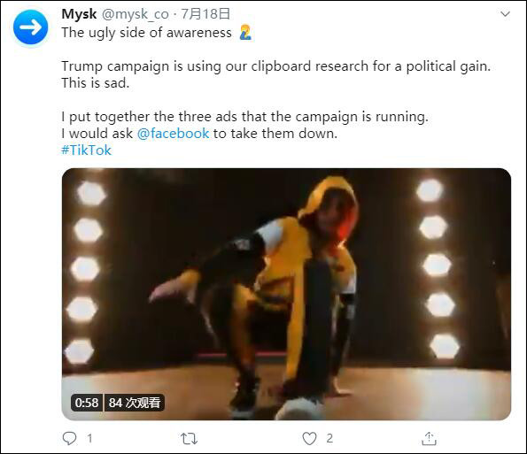 對於特朗普競選團隊的做法,研究報告的發佈公司Mysk表示非常不滿。該公司18日在推特上表示,“特朗普的競選團隊正在利用我們的‘剪貼板研究’來獲取政治利益,這是可悲的。” 該公司還指出,不只是TikTok一款應用軟件在訪問用户手機的剪貼板。