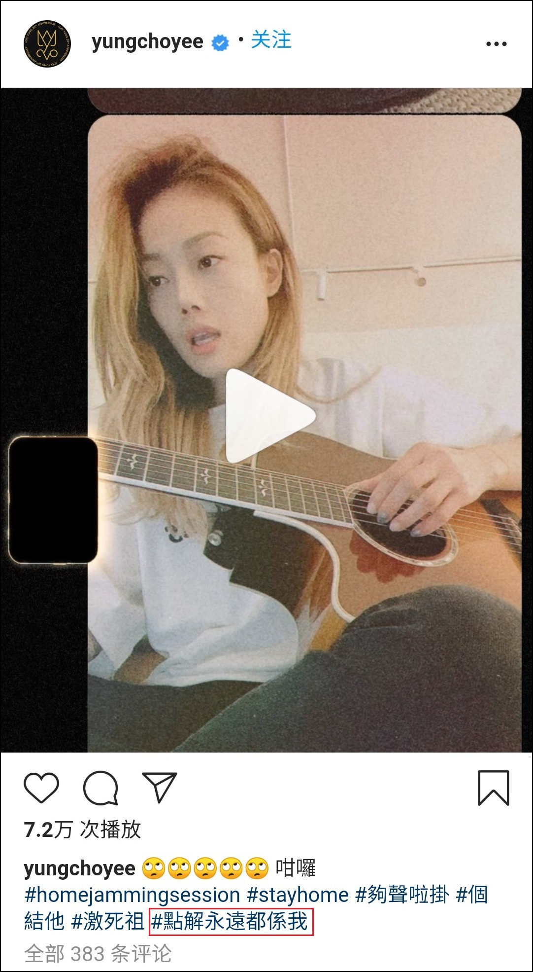值得一提的是,在Instagram上,她發完回應後又分享了自己在家裏自彈自唱的一段視頻,配文中有話題標籤:#點解永遠都系我#(為什麼永遠都是我)。