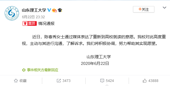 6月22日深夜,山東理工大學通過官方微博發佈通報稱,近日,陳春秀通過媒體表達了重新到高校就讀的意願。山東理工大學對此高度重視,主動與其進行溝通,瞭解訴求。將積極協調,努力幫助其實現願望。