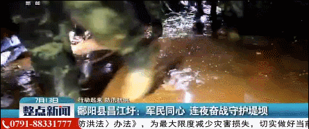在江西昌江圩江家嶺村,武警江西總隊出動1400餘名官兵投入抗洪救災,面對堤壩出現的滲水,300多名官兵輪流跳進深坑排除險情。