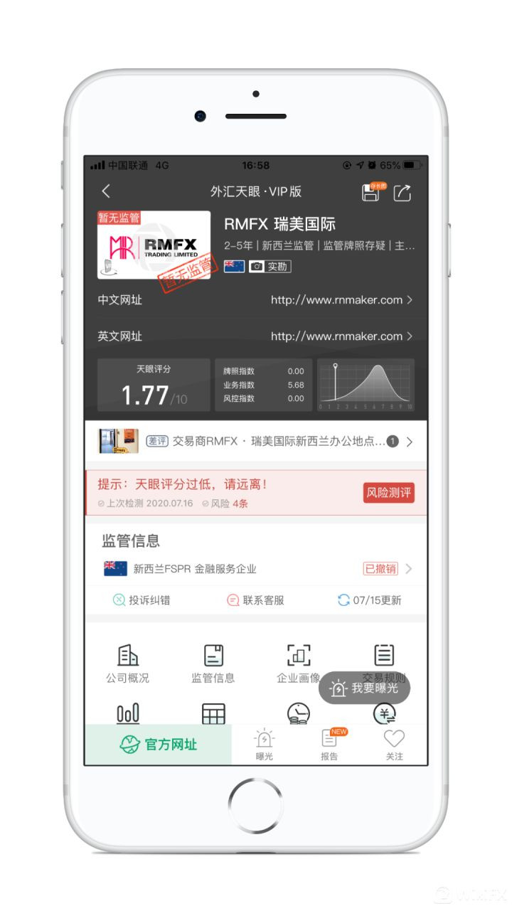 RMFX瑞美國際,天眼評分1.77分,其所持牌照被撤銷後,當前無任何實際有效監管,存在巨大風險,建議遠離!
