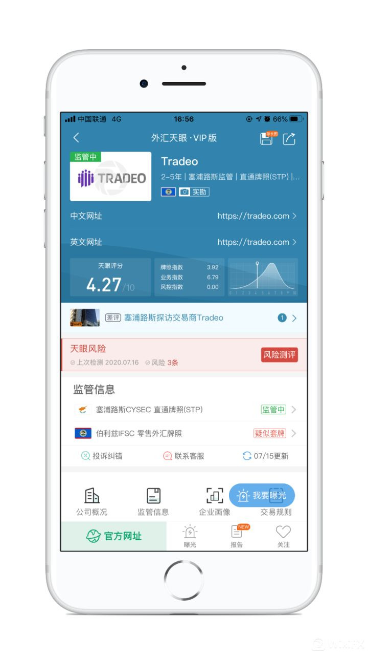 Tradeo,天眼評分4.27分,其持有的塞浦路斯CYSEC授予的直通牌照仍在監管中,建議投資者謹慎選擇。