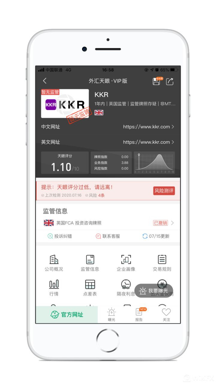 KKR,天眼評分1.10分,其所持牌照被撤銷後,當前無任何實際有效監管,存在巨大風險,建議遠離!