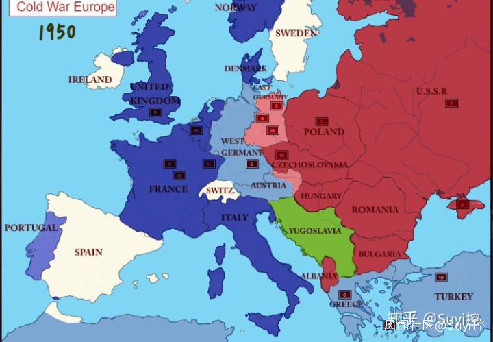 瑞典是永久中立國。而且瑞典不在中歐戰場的主要軸線上,沒有必要遭到波及。西德沒有武裝力量(1955年聯邦國防軍組建),而且不是北約成員國(1955年加入)。西班牙當時是佛朗哥法西斯政權,和北約的關係並不好,和美國甚至還處於斷交狀態(1951年恢復國交),當然也沒加入北約(1982年加入)。當然,美國出於反共的大目標,此時正忙着和佛朗哥貼貼。加入到北約陣營的國家,在歐陸方面預計將包括: