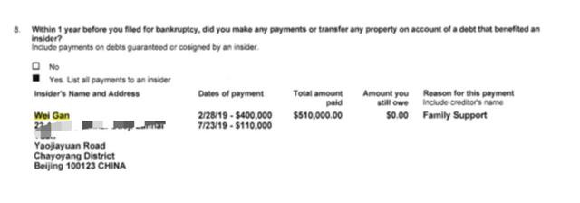 該份文件同時顯示,賈躍亭在提交破產申請前的一年之內,曾分別向甘薇轉賬40萬美元和11萬美元,總計51萬美元(約360萬人民幣),在用途一欄標註的是“家庭費用”。
