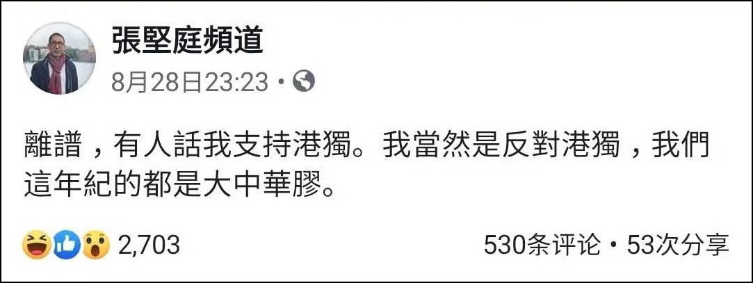 像是在2017年,張堅庭曾經發文稱,“連我們這些賺盡香港給予我們機會的老鬼也開始躁動不安,少中青代心態如何可想而知。”