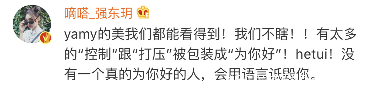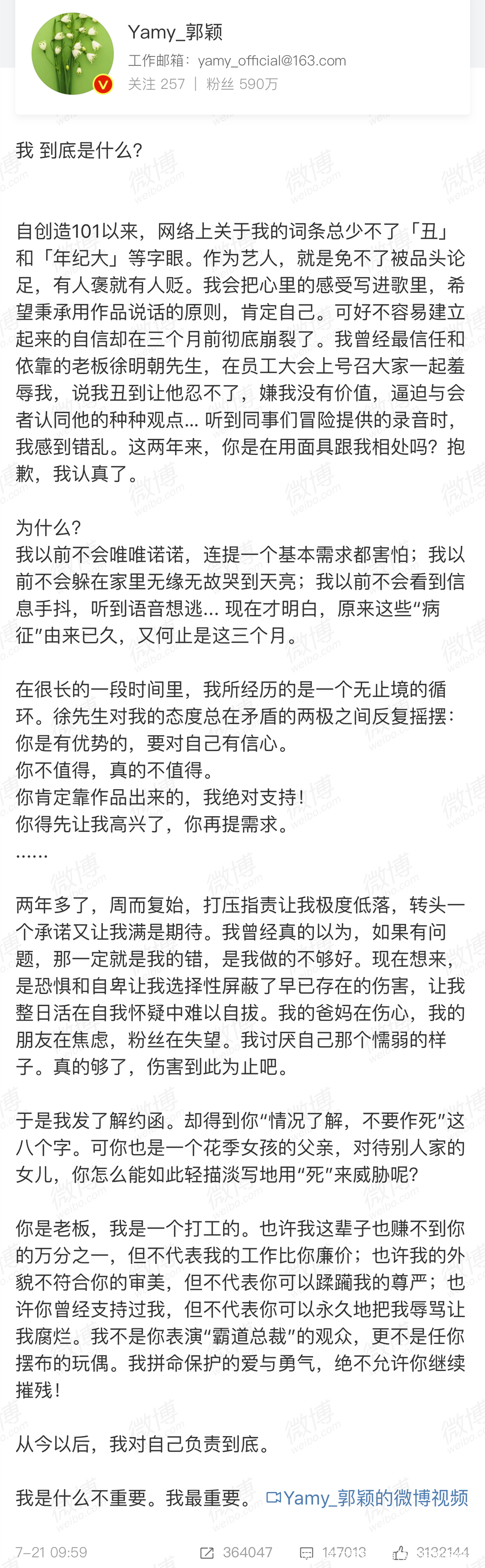 yamy在長文中表示,從她參加《創造101》開始,雖然外界一直有對自己外貌和年紀的討論,但她會把心聲寫進歌裏,希望秉承用作品説話的原則,然而全部自信因為老闆徐明朝的惡語相待徹底崩裂。