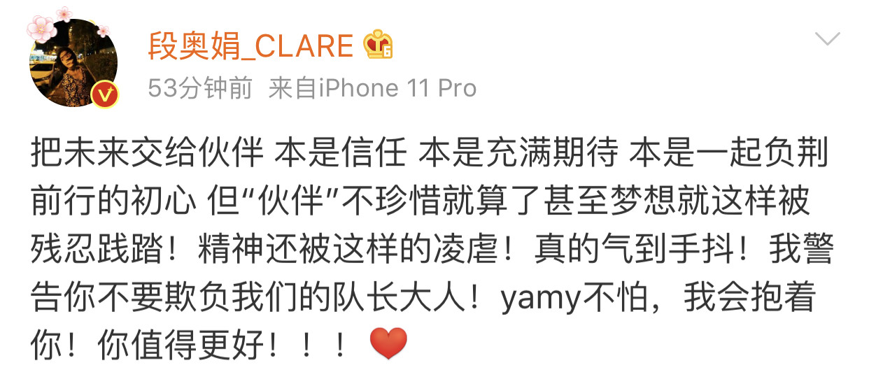 這條博文發佈後引發巨大回響,截至發稿前已經超過36萬轉發,近15萬條評論,300多萬個點贊。除了前火箭少女101的其餘全體成員發文力挺;