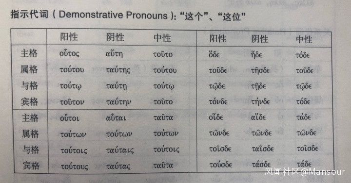 再看看古希臘語,古希臘語的指示代詞分陰陽中性,有複雜的變格: