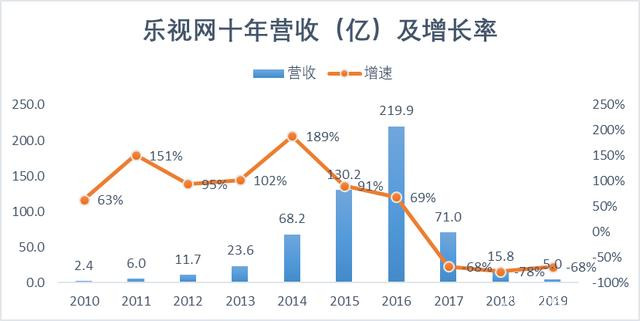 2017年,樂視網的營收在這一年下跌67.7%,但這還遠未觸底。2018和2019年,營收規模又分別下滑77.8%和68.8%。