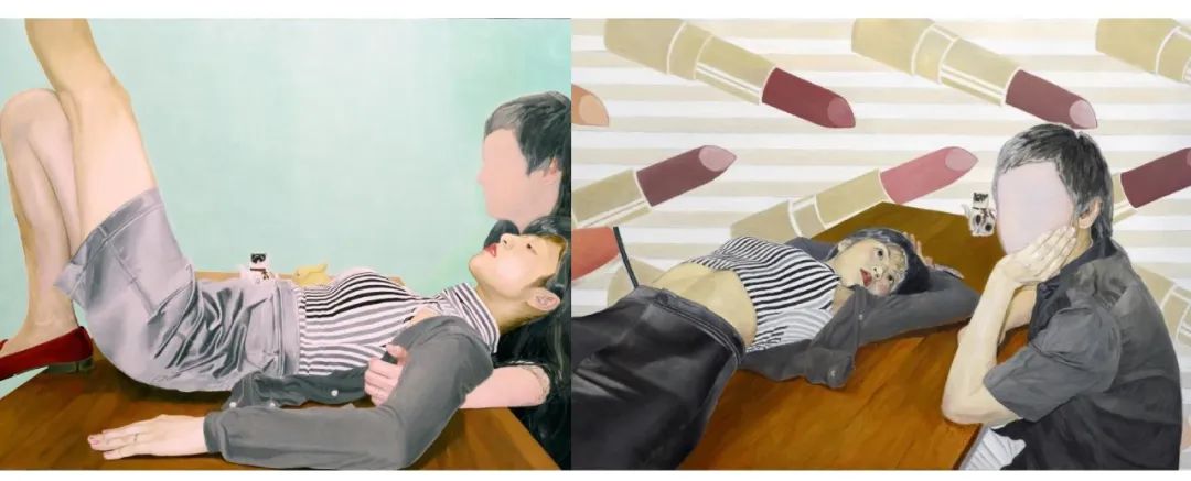 2017年,王春辰老師策劃了一個關於身體的聯展,當時因為種種原因擱置了,沒做成。他看見我的作品之後就問我願不願意做個展,我説好呀好呀,我有新的作品系列,就是“山水花鳥系列”。其實一開始的時候,這畫面上沒有臉的這個人是有臉的,是很精準的兩個人的肖像。