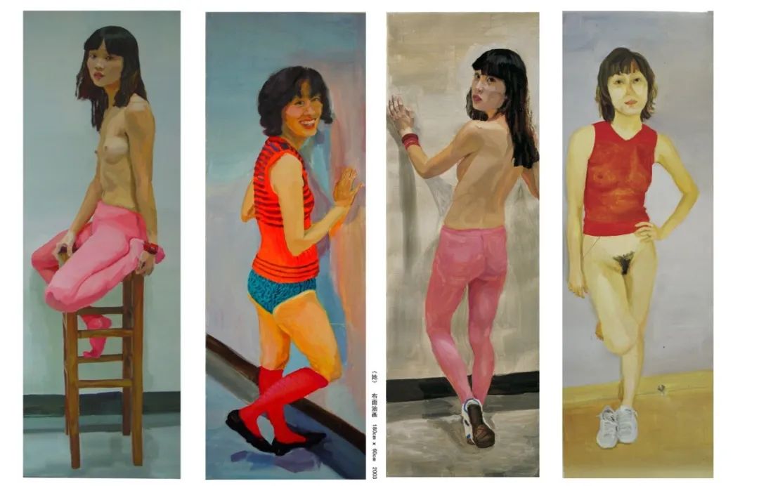我就約了三個女同學,我説咱們能不能拍一些穿得比較少的照片,她們都同意了。我們四人配合,選了一個上完課的下午,就在油畫系教室,把衣服脱了,關好門,開始互拍。互拍的過程比較開心,我們各自覺得自己美的樣子都呈現出來了。到傍晚就拍完了。我拿到圖片以後很滿意,那正是我想要畫的。然後確定畫框尺寸,跟真人等大,這個作品就叫《在沒人的地兒》。
