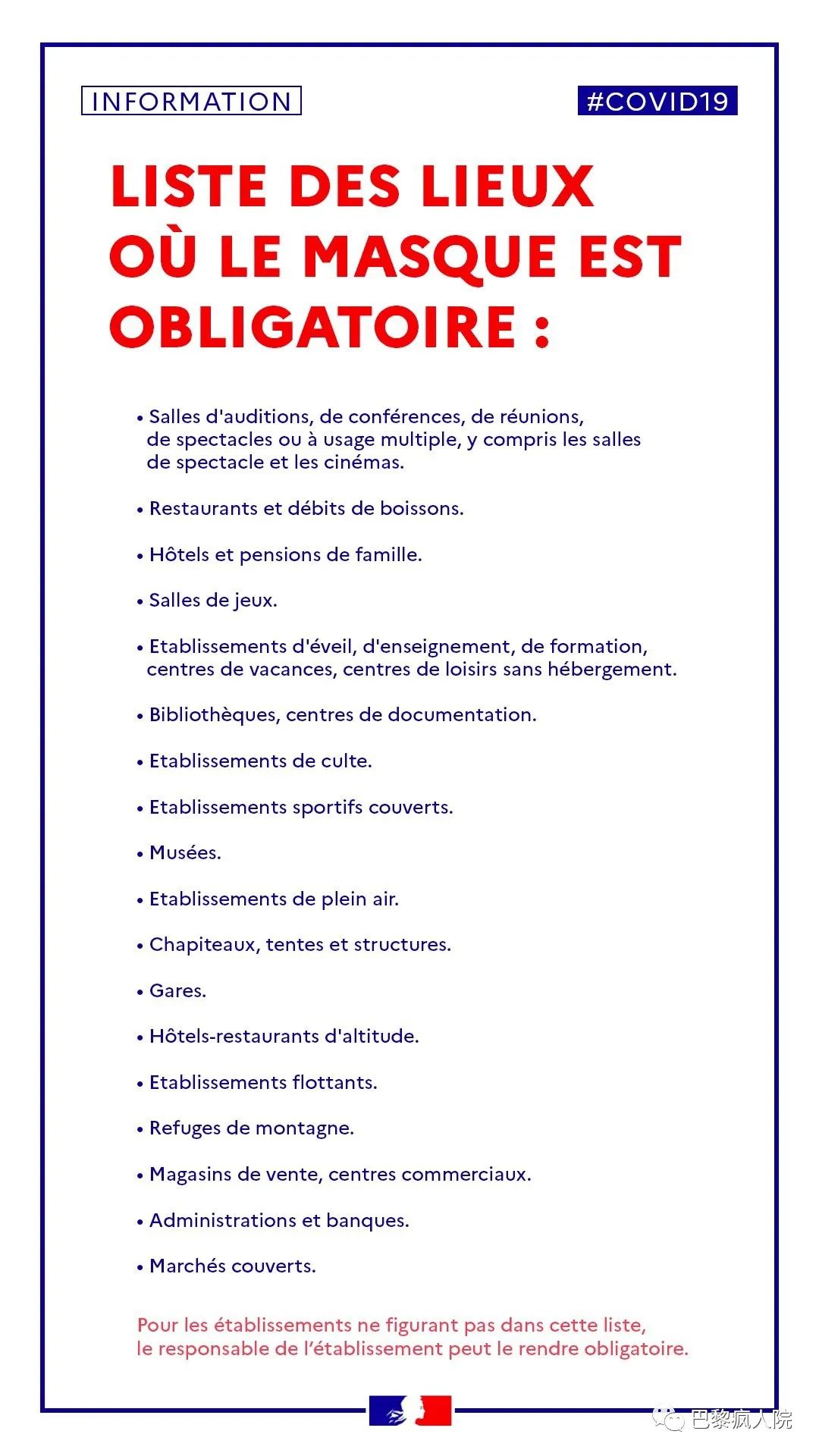 政府要求所有這些涉及到的場所,都必須在政府或衞生部的網站上下載《Ici, le masque est obligatoire》的海報張貼在門口