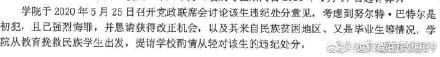可能有點模糊,我仔細辨認將文字轉錄如下:學院於5月25日召開黨政聯席會議討論該生違紀處分意見,考慮到努爾特·巴特爾是初犯且已強烈悔罪,並懇請獲得改正機會以及來自民族貧困地區,又是畢業生等情況,學院從挽救民族學生出發,提請學校酌情從輕對該生的違紀處分。