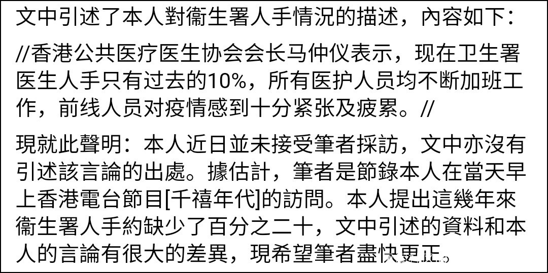 她猜測,該自媒體的文章援引其説法可能來自於自己當天早上接受香港電台節目《千禧時代》的訪問。她強調,“本人提出這幾年來衞生署人手約缺乏了百分之二十,文中引述的資料和本人的言論有很大的差異,現希望筆者儘快更正”。